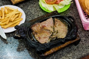 - Bò bít tết – Vietnamese beef steak served in a cow pan!